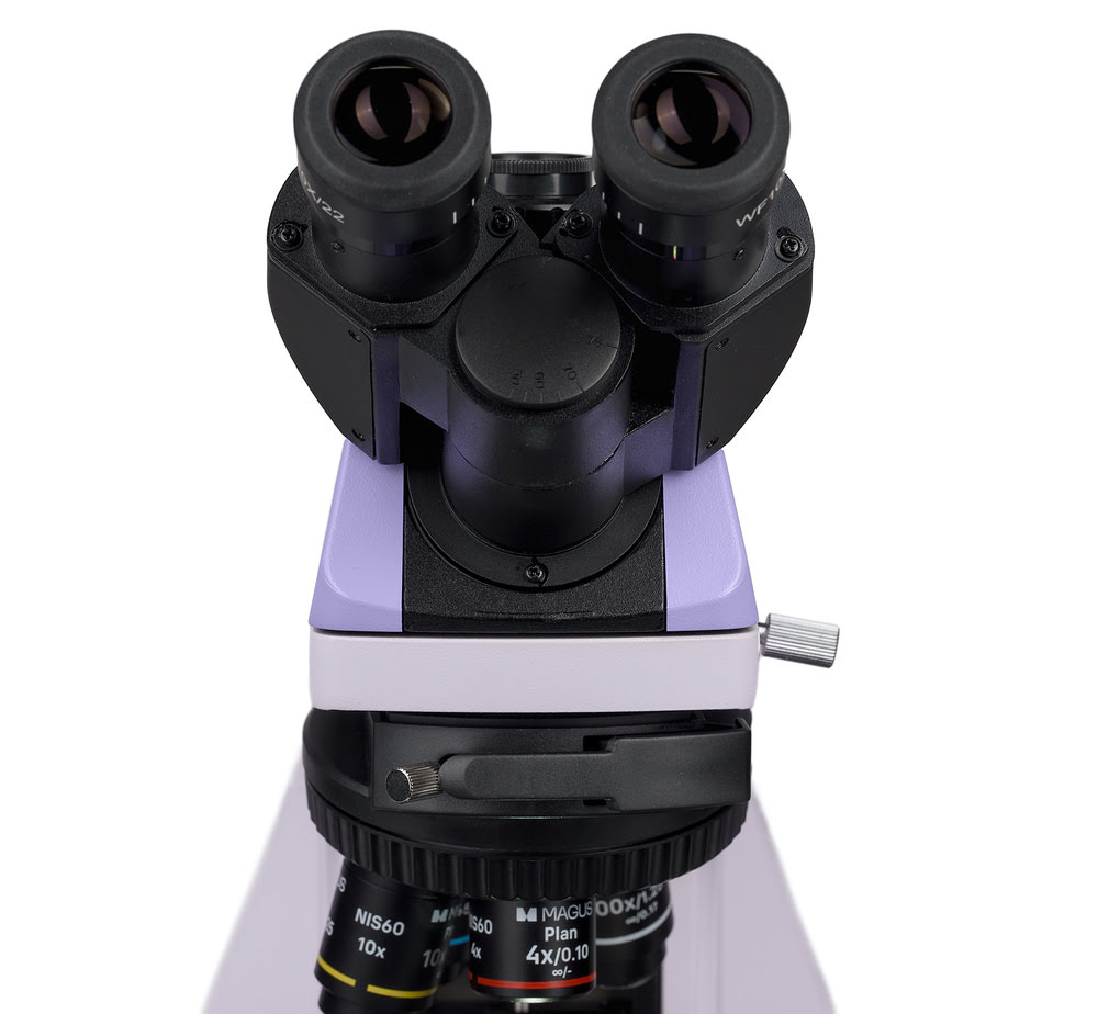 Лабораторный биологический микроскоп MAGUS Bio 260T снабжён визуальной насадкой из бинокулярной части (наклон 30°) и вертикального тубуса для установки цифровой камеры с делителем светового потока 50/50.