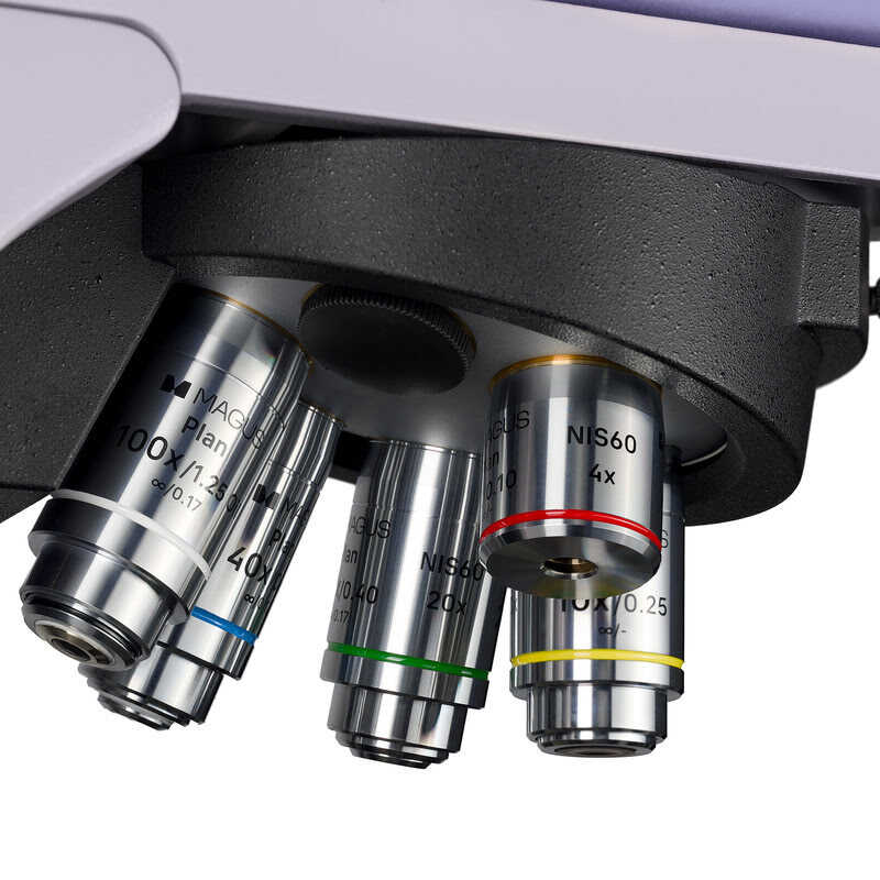 Планахроматические объективы, скорректированные на бесконечность, вкупе с окулярами дают увеличение до 1000 крат (опционно – до 2000 крат) и помещаются в моторизированное револьверное устройство.