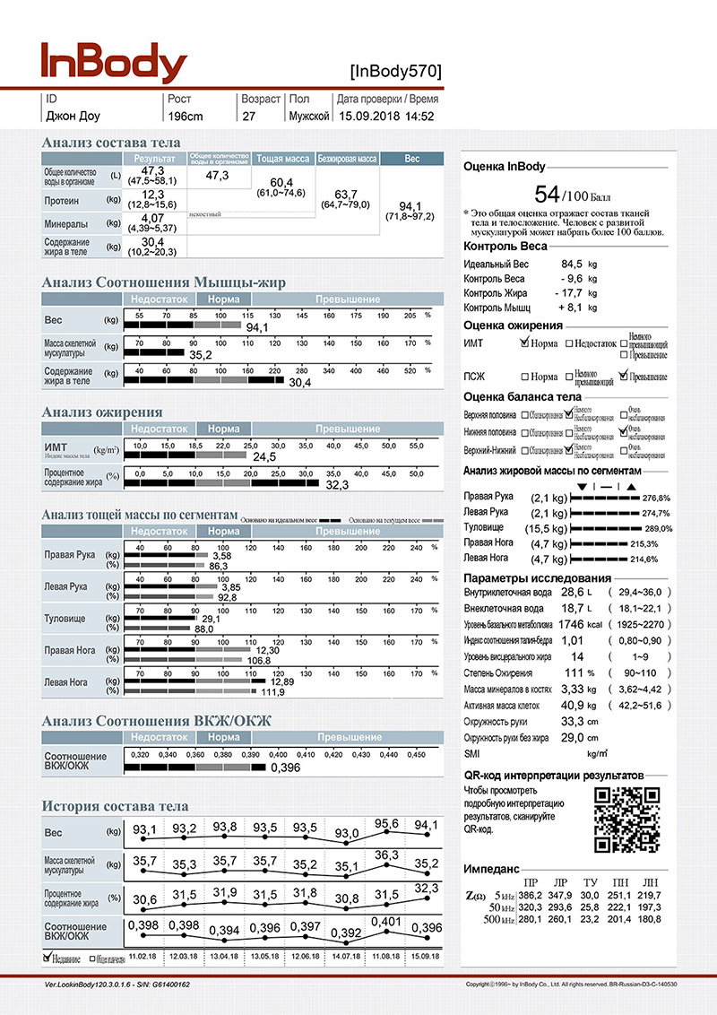 - Данные о составе тела: воды, протеинов, минералов, жира.