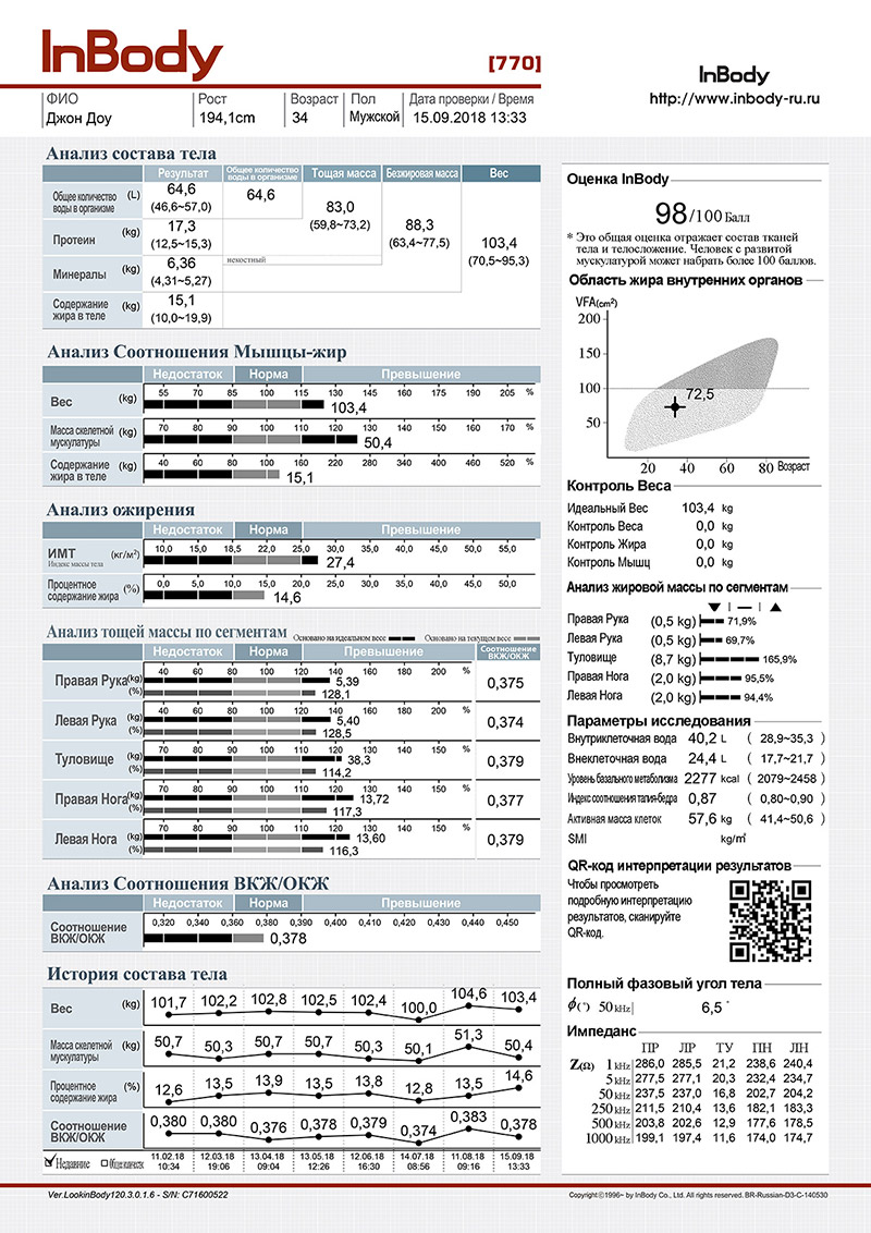 - Характеристиках тела, зависящих от питания (внутриклеточная вода, уровень висцерального жира, базальный метаболизм, соотношение «талия-бёдра», степень ожирения и пр.). Отсканировав QR-код, врач получает полный перечень результатов;