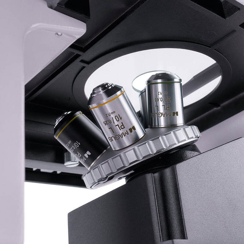«Бесконечные» планахроматические объективы и окуляры 10х/22 мм с удалённым зрачком обеспечивают увеличение до 400 крат (опционно – до 1000 крат). Рабочее расстояние объективов увеличено для работы с посудой с толщиной дна 1,2 мм. Три объектива применяются для исследований в светлом поле, один – по фазово-контрастному методу.