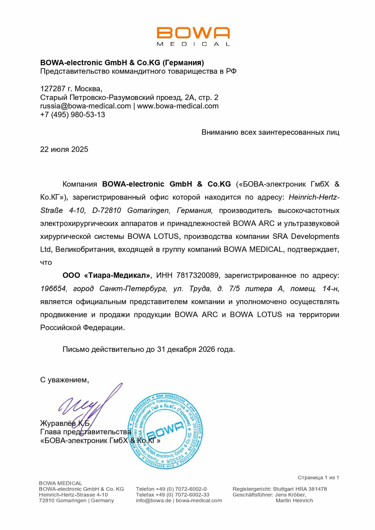 Аппарат BOWA ARC 100 прошёл необходимые испытания, имеет Регистрационное удостоверение и Декларацию соответствия.