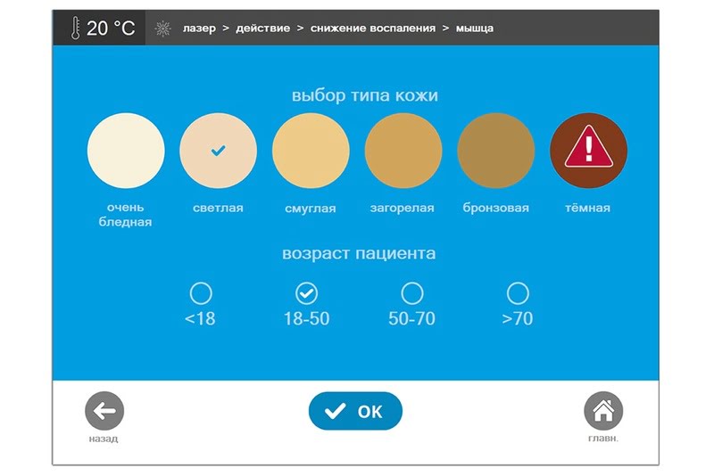 - Волна 1120 нм обеспечивает расслабление и обезболивание на уровне мышечной ткани и при болевых ощущениях воспалительного характера. Глубина проникновения – до 6 см;