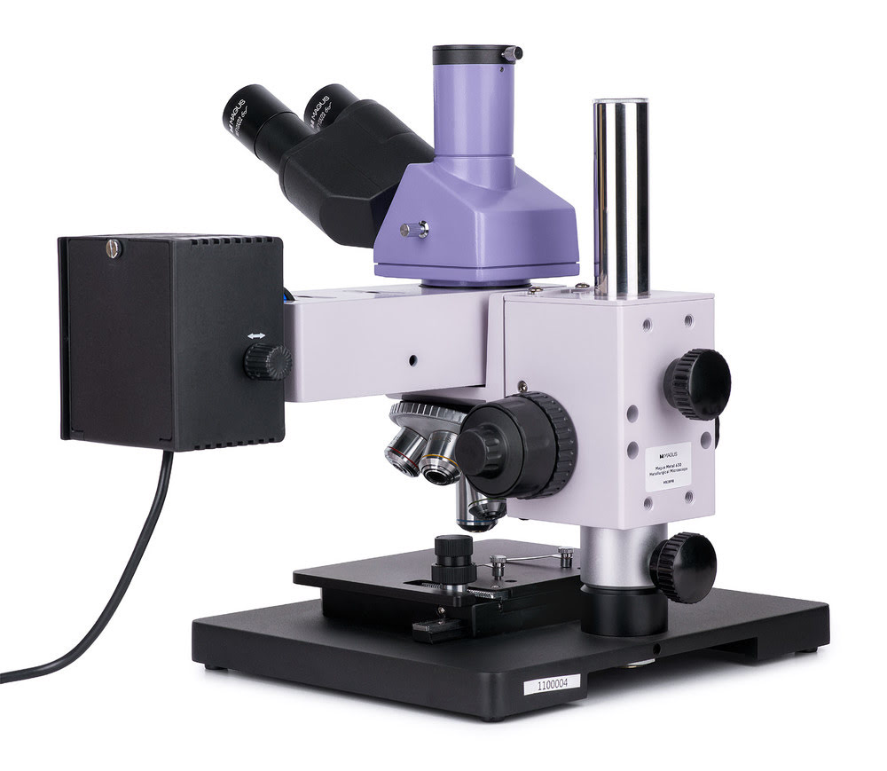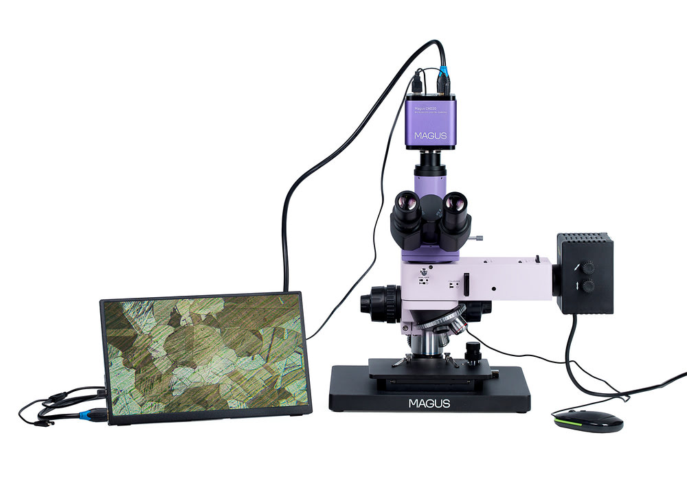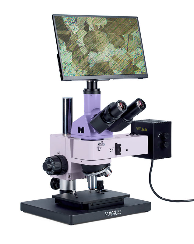 MAGUS Metal 650 – металлографический микроскоп с увеличением 50–800 крат (опционально до 2500 крат), оптика планахроматическая, скорректированная на бесконечность, большой механический предметный столик с перемещением по двум осям, галогенная подсветка с регулировкой яркости.