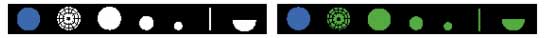- 7 апертур (с «бескрасным» фильтром). Для широкого и узкого зрачков. Включают в себя щель, фиксационную звезду с линейкой, большой и малый круг, точку, щель, полукруг, кобальтовый голубой фильтр и «бескрасный» (свободный от красного) фильтр для улучшения контрастности - с теми же апертурами.