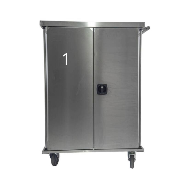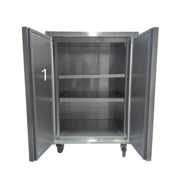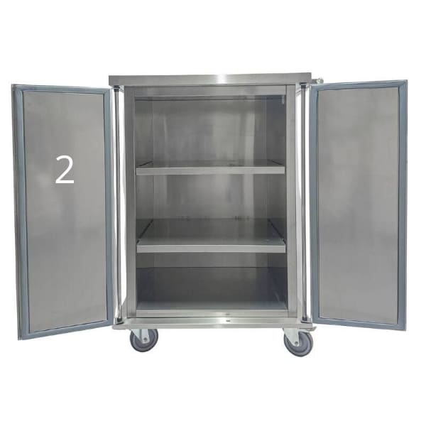 Двустворчатая медицинская тумба М-ТОн-80 изготовлена из нержавеющей стали AISI 304 и снабжена четырьмя поворотными колесами, что позволяет удобно перемещать ее по помещению. Тумба имеет две полки.